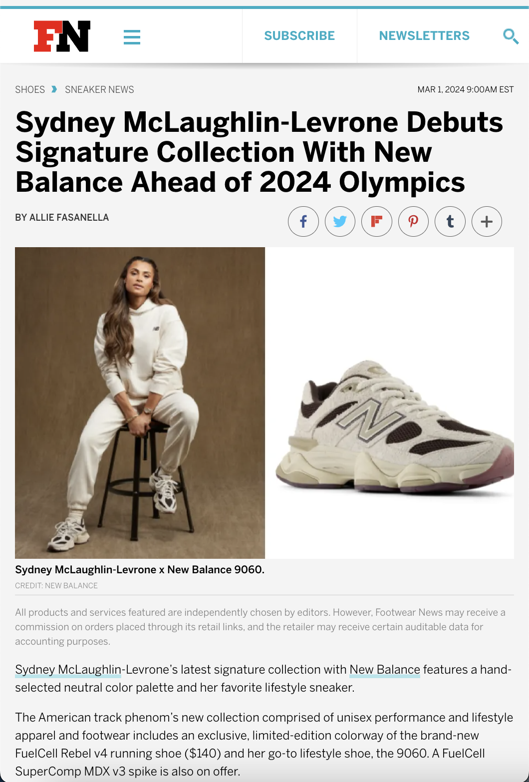 Her collection offers elevated everyday apparel such as a premium terry hoodie and sweatpants set, sleek high-rise leggings for training or lounging, and an iconic New Balance varsity jacket. Additional footwear featured in Sydney’s collection is the FuelCell SuperComp MDX v3 spike and her favorite lifestyle shoe, the 9060.