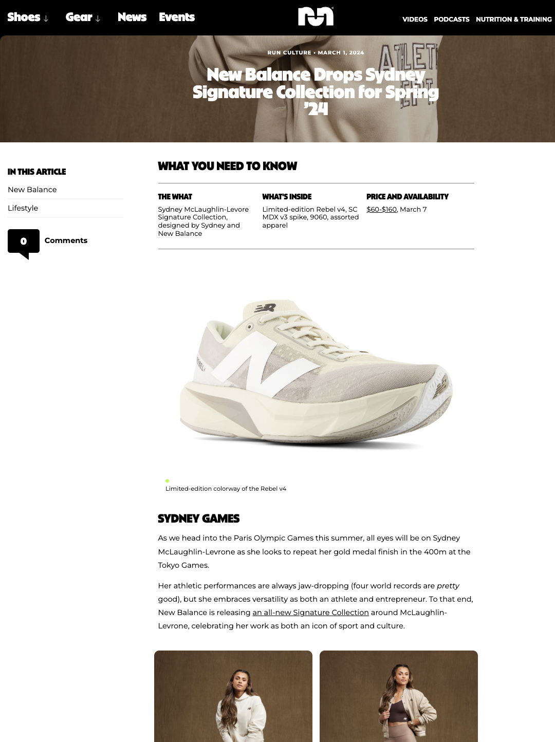 Designed in collaboration with Sydney McLaughlin, the collection features unisex performance and lifestyle products with exclusive footwear and apparel, showcasing her elevated, everyday aesthetic. The collection includes a hand selected neutral color palette and personal touches. Made for those who live an active lifestyle with running as their go-to activity, paired with the Rebel v4 powers superior everyday performance without compromising on style.